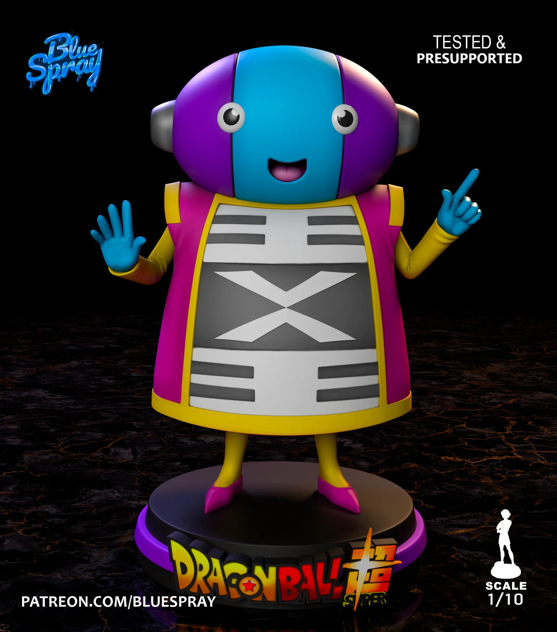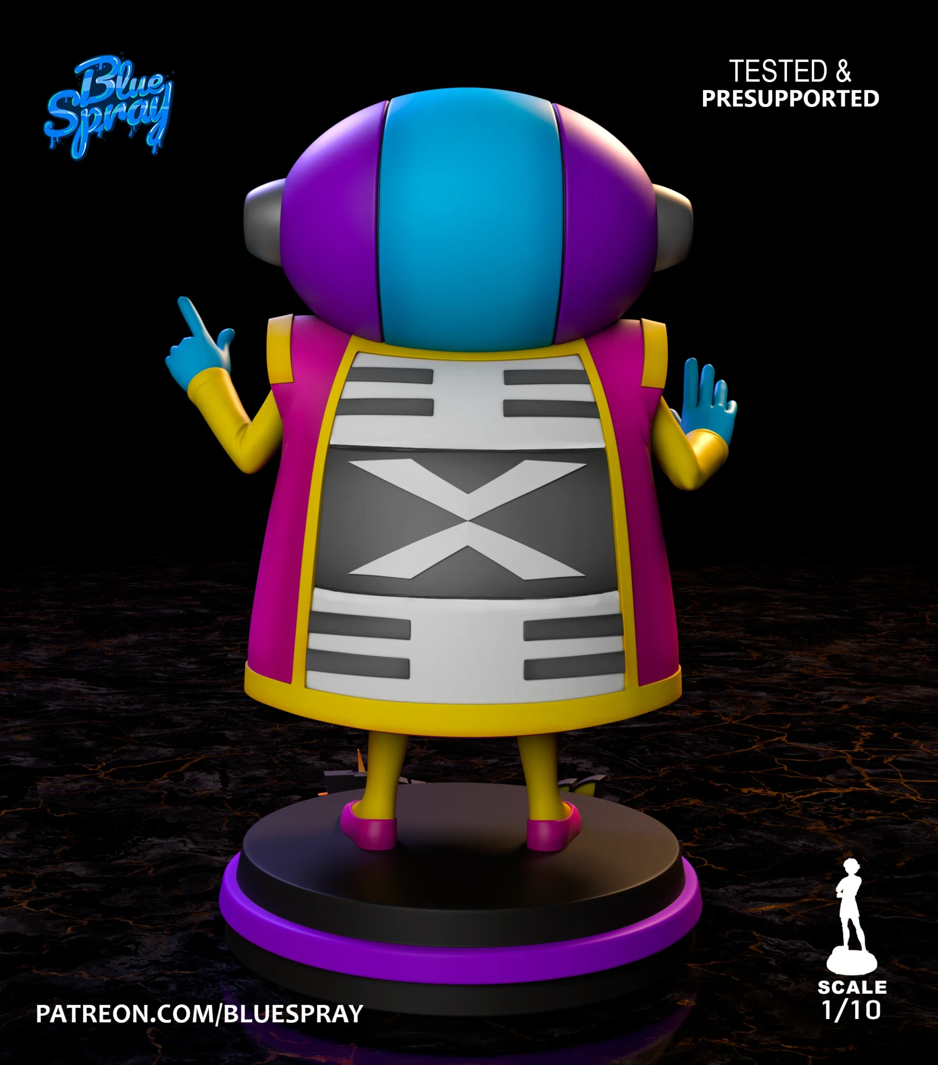 Imprimée en résine haute définition, cette figurine retranscrit fidèlement son design unique : silhouette colorée, visage enfantin et aura cosmique qui impose respect et fascination.