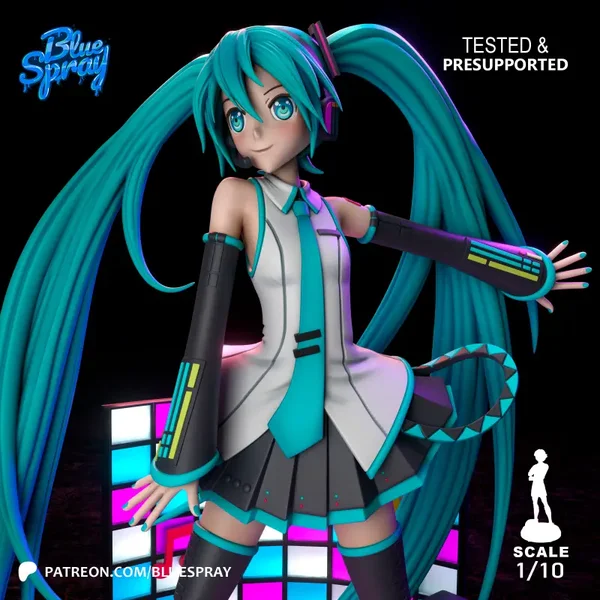 Plongez dans l'univers vibrant de la pop virtuelle avec cette figurine 3D de Hatsune Miku, l'icône mondiale des Vocaloids. Cette sculpture dynamique capture l'énergie de la scène, mettant en avant sa pose emblématique, ses doubles queues de cheval et son costume futuriste. La base thématique, ornée de touches de piano illuminées et de détails musicaux, complète parfaitement l'ensemble. Idéale pour les fans de musique et de culture pop.