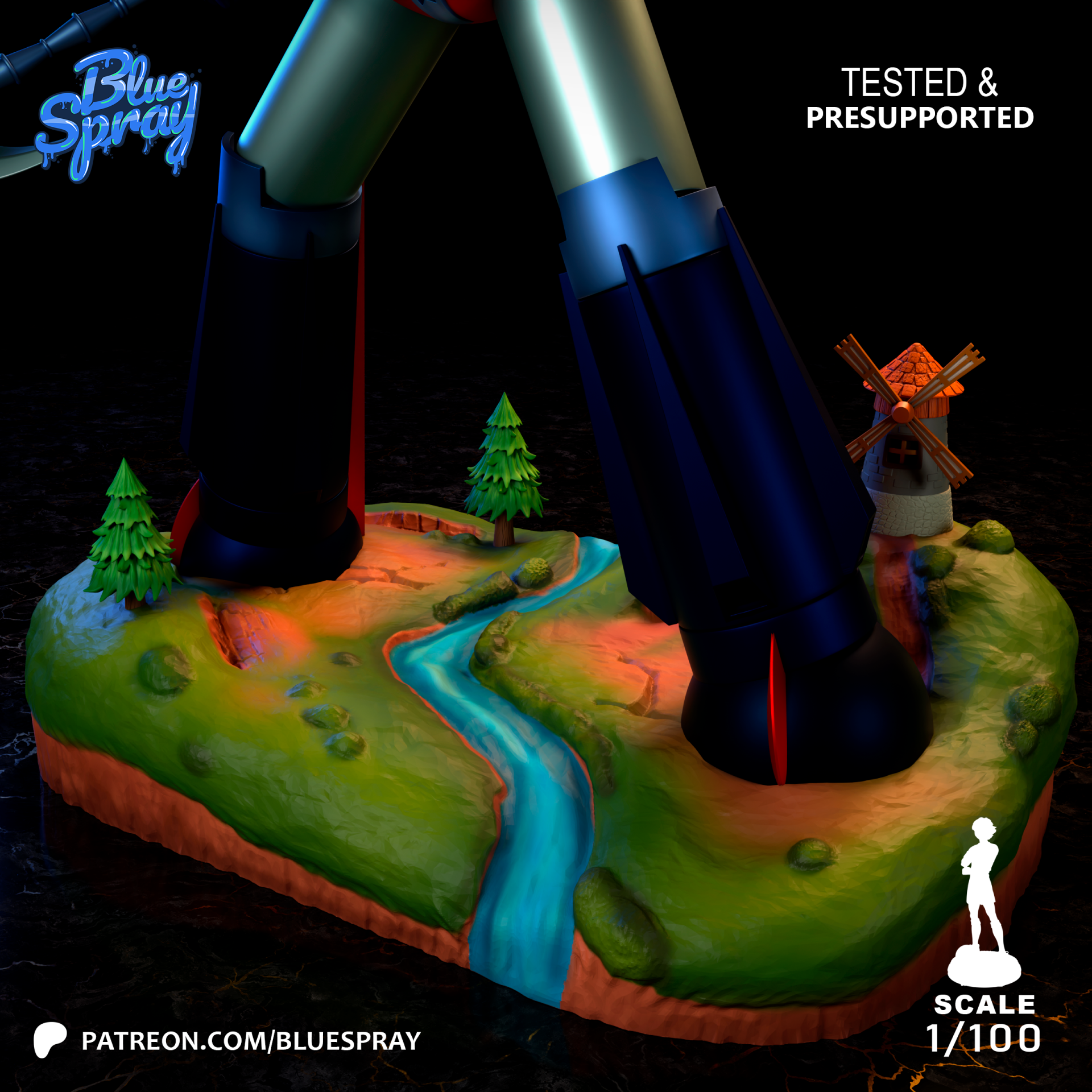 Inspirée de l’univers des robots géants de science-fiction, cette pièce met en scène un mecha imposant dans une posture dynamique, posé sur un socle décoratif travaillé (relief, végétation, cours d’eau).
