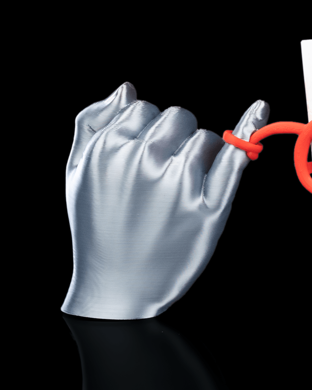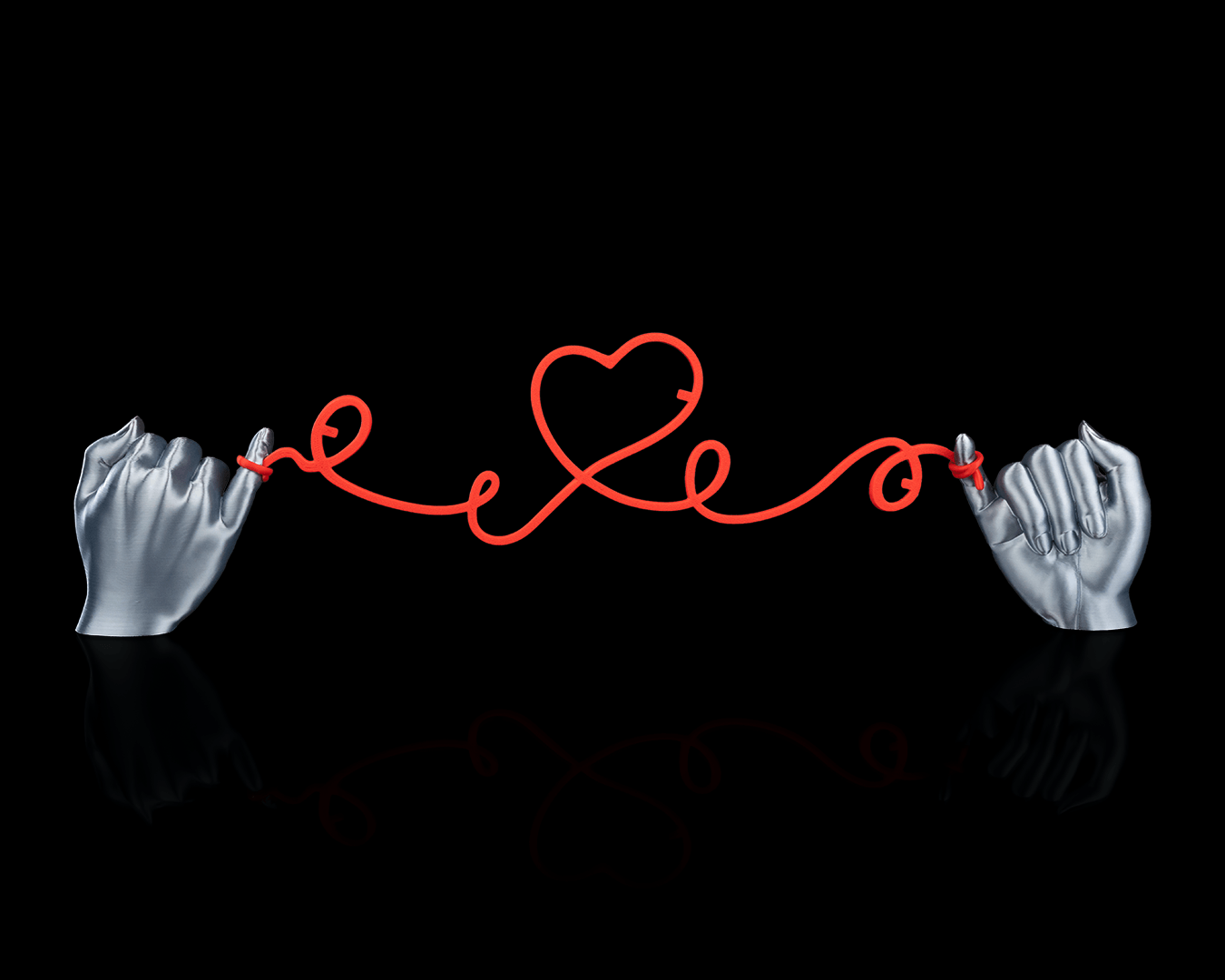 Ce support photo en impression 3D représente deux mains stylisées tenant un fil qui serpente et forme un cœur au centre. Le fil, volontairement flexible et ondulé, permet d’y glisser plusieurs photos au format Polaroid, mini-prints ou cartes souvenirs.